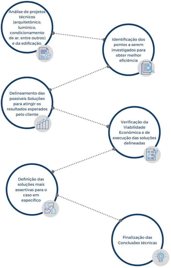 No processo de consultoria é analisado criteriosamente as definições projetuais e construtivas que podem ser aperfeiçoadas para um melhor desempenho energético da edificação e, posteriormente, é traçado soluções técnicas que estejam dentro das expectativas previstas e financeira.